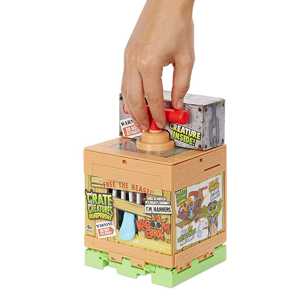 Crate Creatures KaBoom монстр Наннерс — игрушка-сюрприз! Снаружи игрушка представляет собой коробку с решеткой, из которой торчит язык, а сверху коробки находится вентиль. Когда вы его повернëте, он взорвется, и коробка разлетится во все стороны! Если потянуть за язык, можно услышать рычание монстрика.