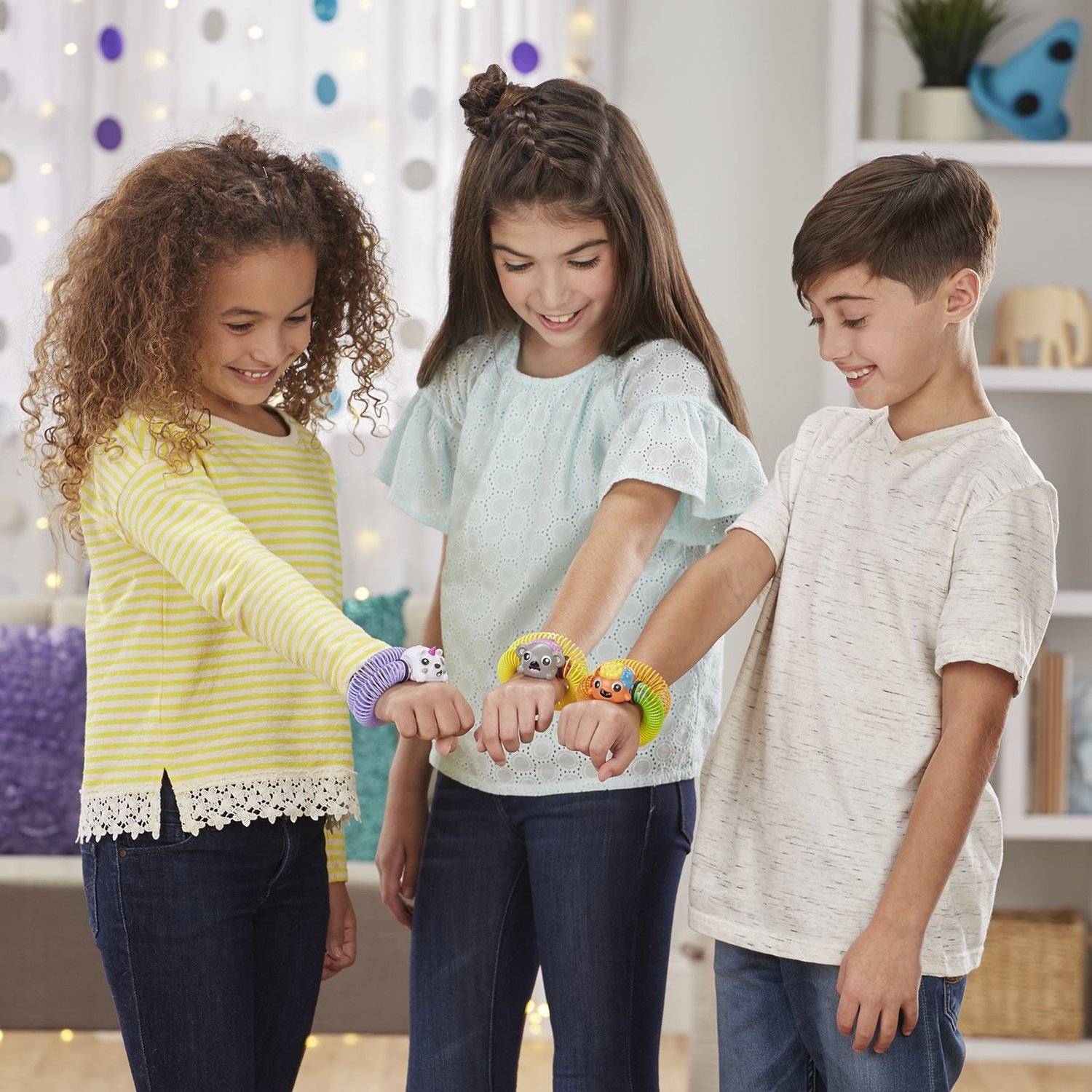 Интерактивные питомцы-браслеты Зупы выглядят модно и интересно! У них головы зверьков, а вместо туловища пружинки slinky. Чтобы играть, нужно соединить края браслета и нажать на голове кнопку. Он начнет вибрировать, крутиться, переворачиваться, играть с мячиком и собирать фигурки-угощения.
