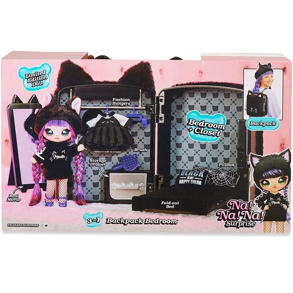 Чёрный рюкзачëк — 3 в 1: спальня, гардеробная и сам рюкзачëк. Внутри вы также найдете красивую куколку Na! Na! Na! с розовыми волосами в чёрном худи, колготках в сеточку, красивых туфельках, и пушистой шапочкой с ушками котёнка.