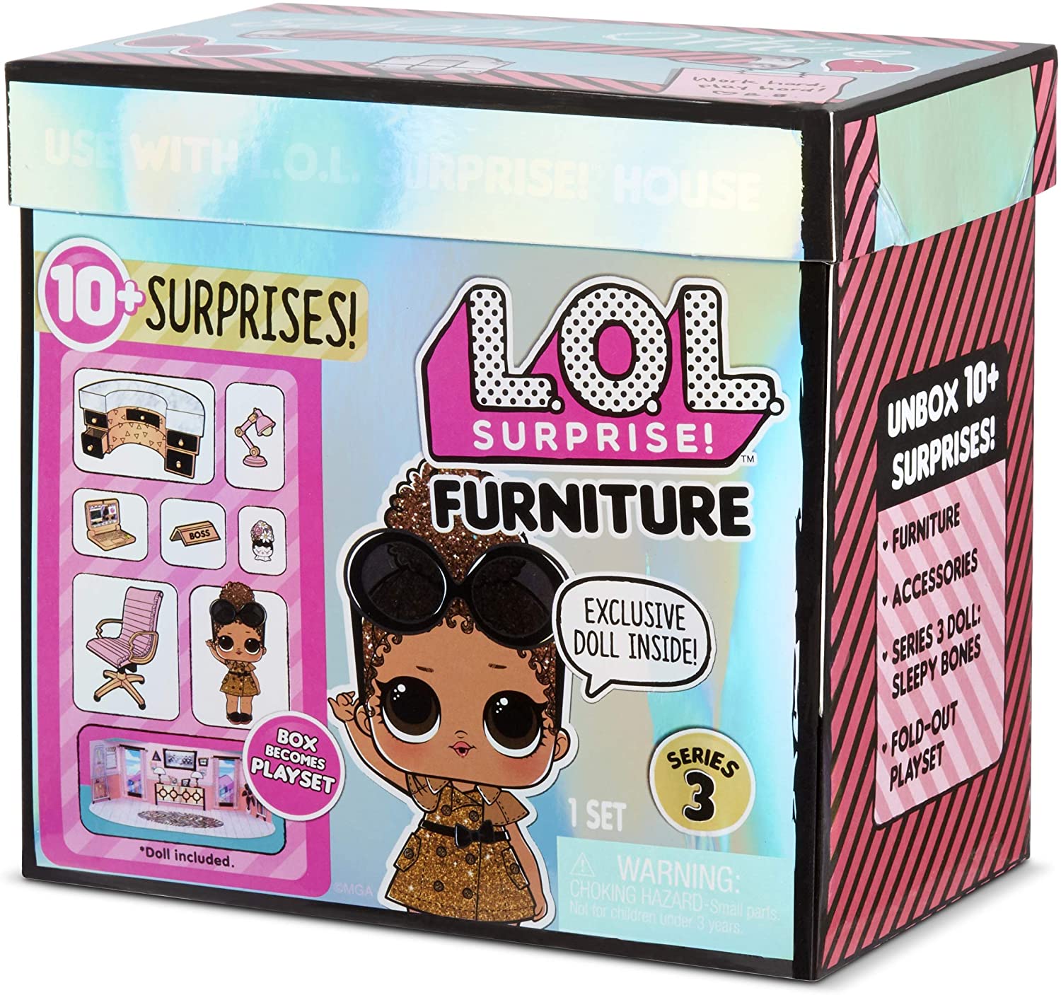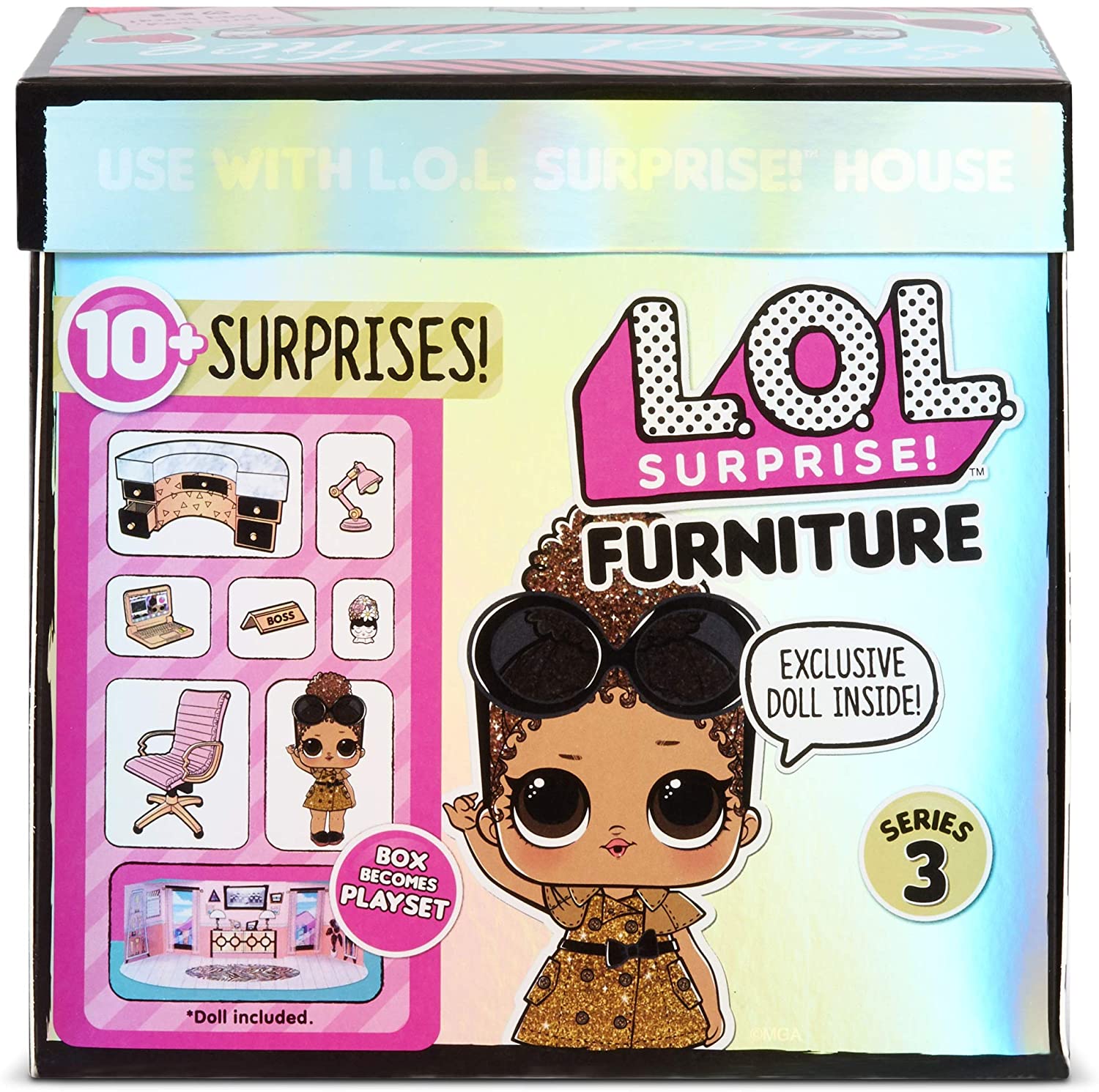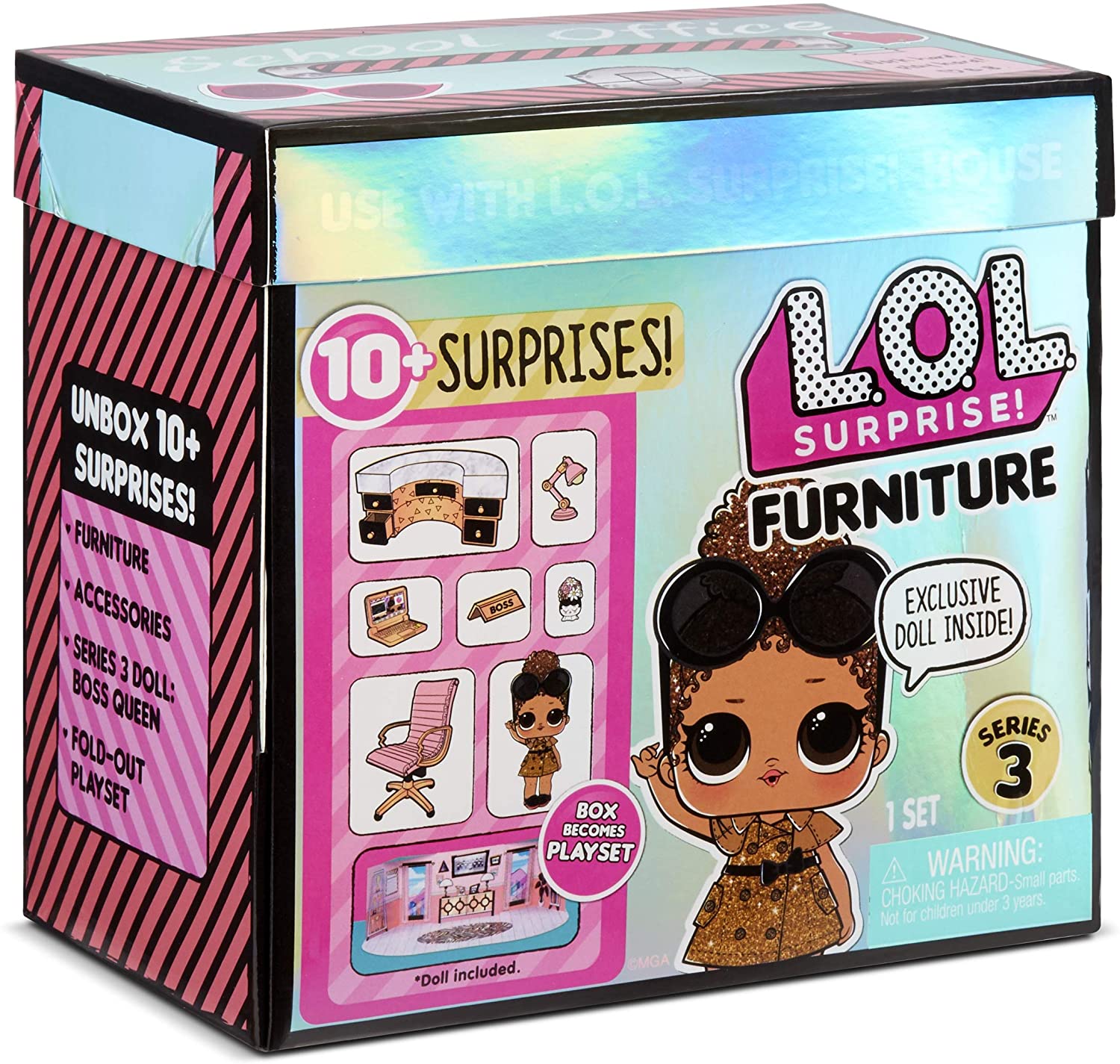 MGA Entertainment LOL Surprise Furniture 3 School Office — кабинет директора школы. Кукла Boss Queen модная и блестящая, а ее кабинет также выполнен в розово-блестящих тонах.