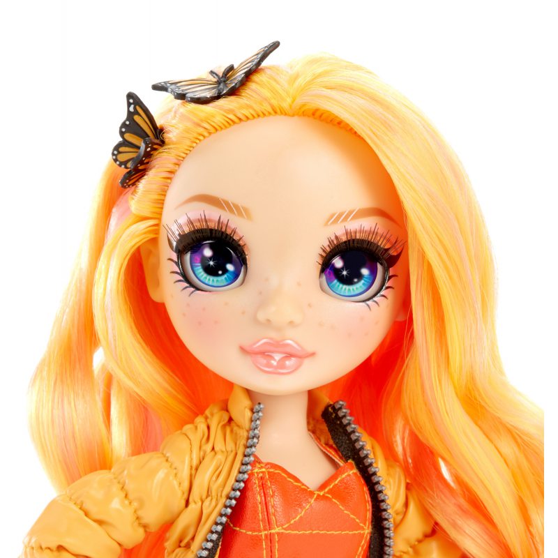 Поппи Роуэн – блистательная солнечная кукла, которая очень любит оранжевый цвет. Она умело сочетает оттенки нежно-персикового, ярко-рыжего и спокойного бежевого. Поппи точно знает, каково быть в центре внимания, ведь ее стиль неординарен и примечателен, а украшения в виде бабочек отлично дополняет костюм.