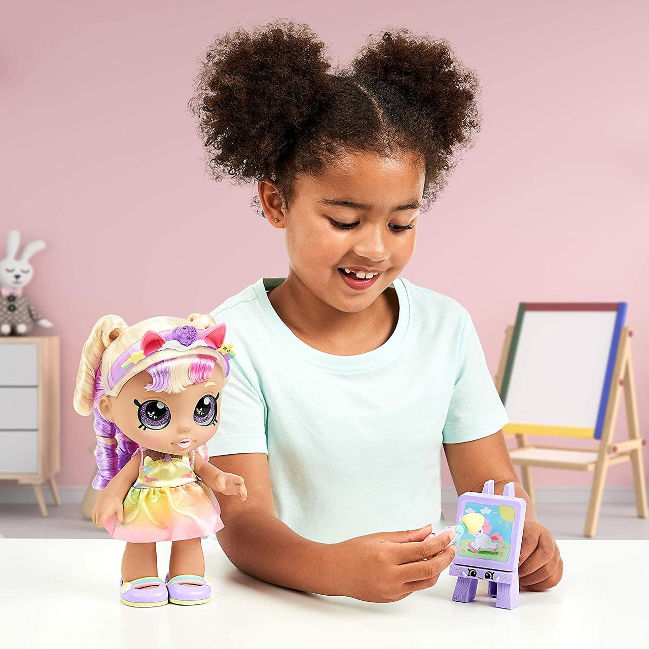 С куклами Kindi Kids оживает все вокруг: посуда, мебель, любимые игрушки. Ребенок погрузится в волшебную атмосферу игры и приятных открытий. Ведь аксессуары, входящие в набор тоже интерактивные. Окуните кисточку в холодную воду и проведите по мольберту — через несколько секунд вы увидите картину.
