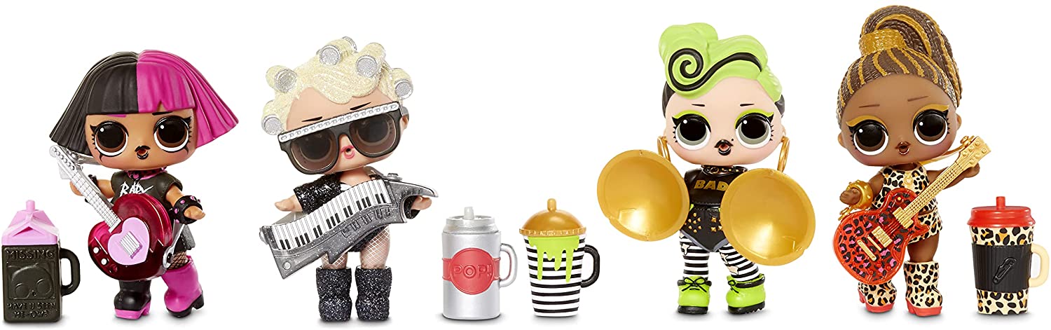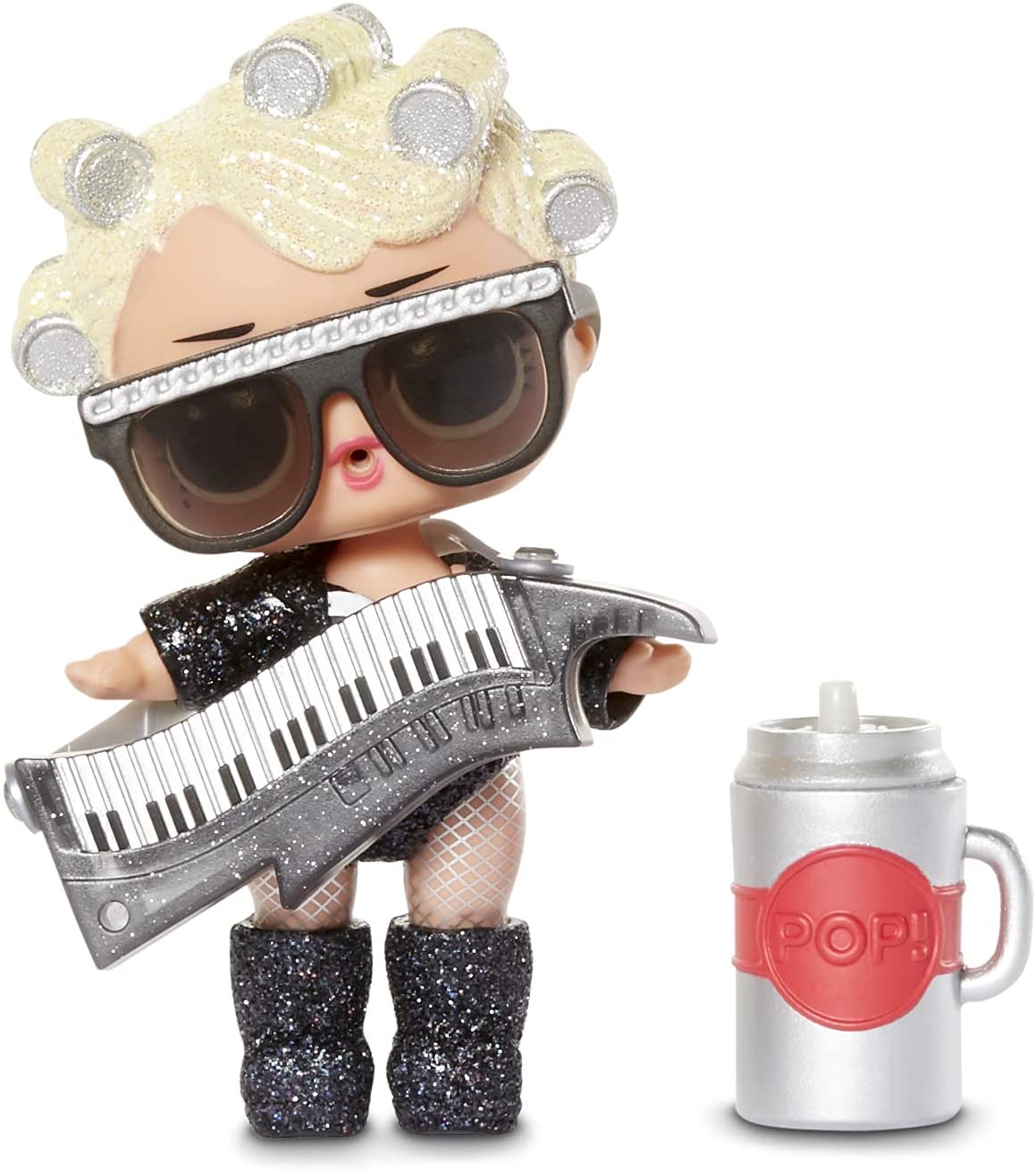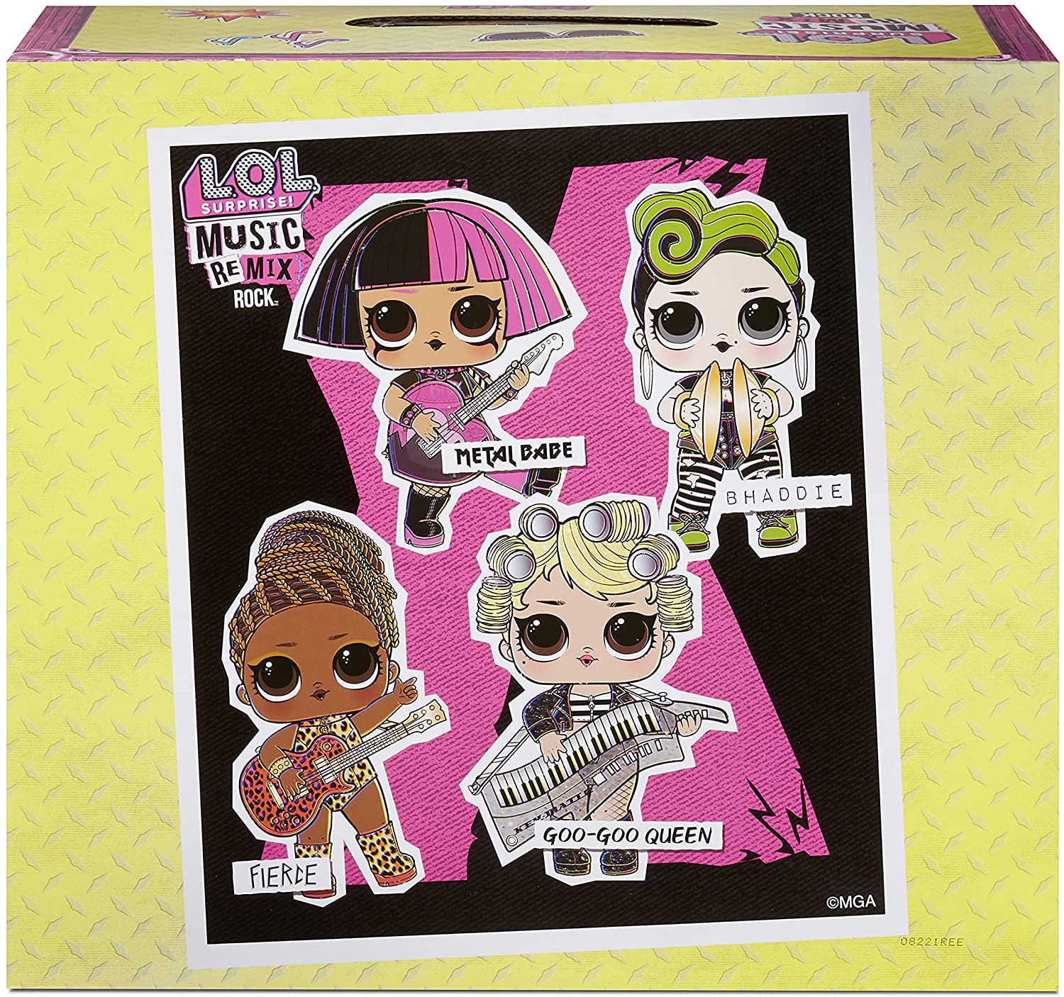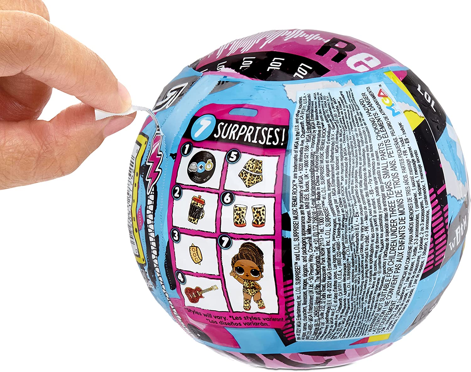Новая серия куколок LOL Surprise Remix Rock Dolls представлена 4 новыми персонажами, которые являются сестричками больших куколок OMG этой же серии - Metal Babe, Bhaddie, Fierce и Goo-Goo Queen. Внутри шара находятся 7 сюрпризов: куколка, одежда, обувь, музыкальный инструмент, бутылочка для питья, наклейка и секретное сообщение. Куколка имеет водные способности, про которые можно узнать из коллекционного листа.