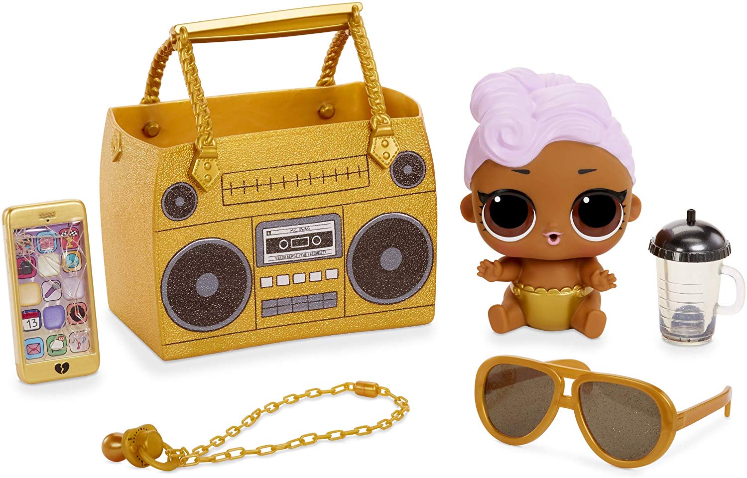 Сумочка малышки выполнена в форме бубокса – ведь ее зовут LIL DJ, а это значит, что она знает все о хорошем звуке и отлично управляется с музыкальной аппаратурой! Золотистая цепочка, очки и телефон – станут отличным дополнением для любой игры.
