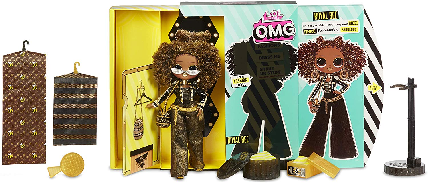 Модница LOL Surprise OMG Fashion Royal Bee высотой 28 сантиметров одета в стильный костюм коричневого цвета и действительно напоминает пчелку. В комплекте с фэшн-куклой – сверкающие серебристые очки и удобная коричневая сумочка на золотой лямке, переливающийся пояс, коробочки для хранения аксессуаров и даже миниатюрные чехлы на одежду!