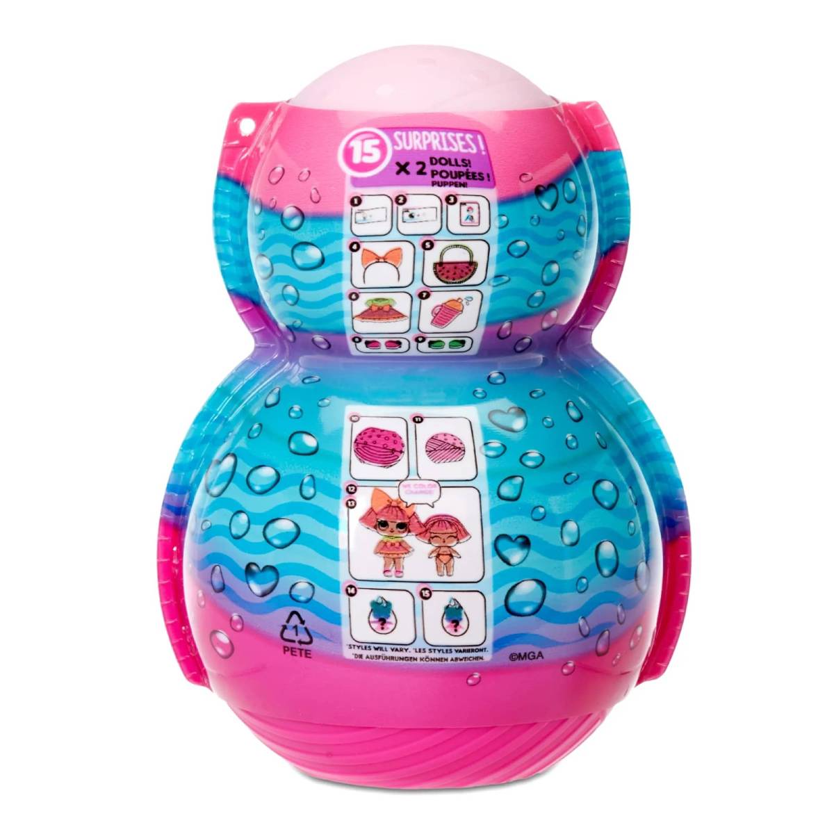 В наборе вас ждут аксессуары-сюрпризы, включая одежду и аксессуары, а также бутылочку для воды.