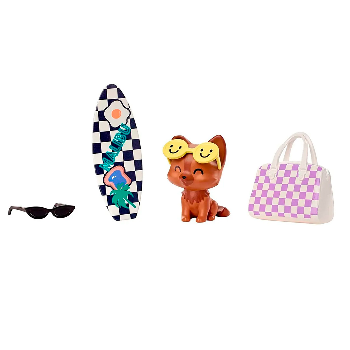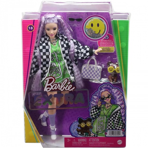 Барби – с длинными завитыми волосами лавандового цвета, наполовину собранными в конский хвост. Кукла одета в неоново-зеленое платье из джерси, оверсайз-жакет в черно-белую клетку, лиловые носки и белые туфли с ремешками. Клетчатая сумка в тон, черные солнцезащитные очки и множество многослойных украшений расставляют эффектные акценты. Компанию кукле составляет очаровтаельный щенок на сёрфе и в очках. Игры с куклой помогают развивать чувство стиля и способствуют творческому самовыражению.
