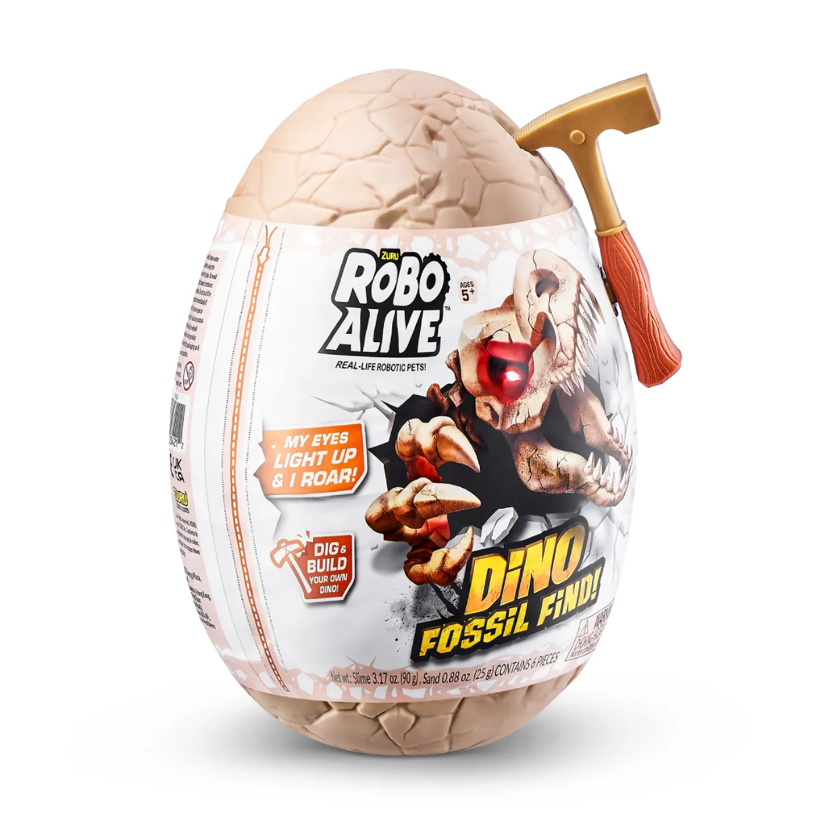 С Robo Alive Dino Fossil Find вас ждут незабываемые приключения! Исследуйте удивительные находки и почувствуйте себя настоящим археологом. Копайтесь в песке и слизи, используя инструмент для раскопок, чтобы найти 1 из 4 окаменелостей динозавра. Грозный Ти-Рекс, ужасающий Трицератопс, потрясающий Анкилозавр или поразительный Стегозавр? Кто попадётся вам? Соберите все части окаменелостей, чтобы оживить скелет! Светящиеся глаза и реалистичный рёв — этот динозавр точно не похож на тех, кого вы видели раньше.