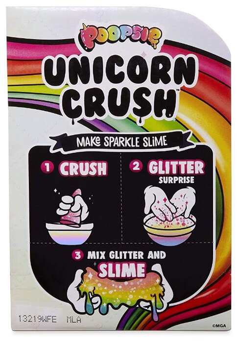 Новинка от MGA Entertainment – комплект для создания слаймов Poopsie Unicorn Crush with Glitter and Slime Surprise. Чтобы сделать слайм своими руками, ребенку достаточно смешать ингредиенты из набора. А кейс в виде рога единорожки поможет хранить получившуюся игрушку.