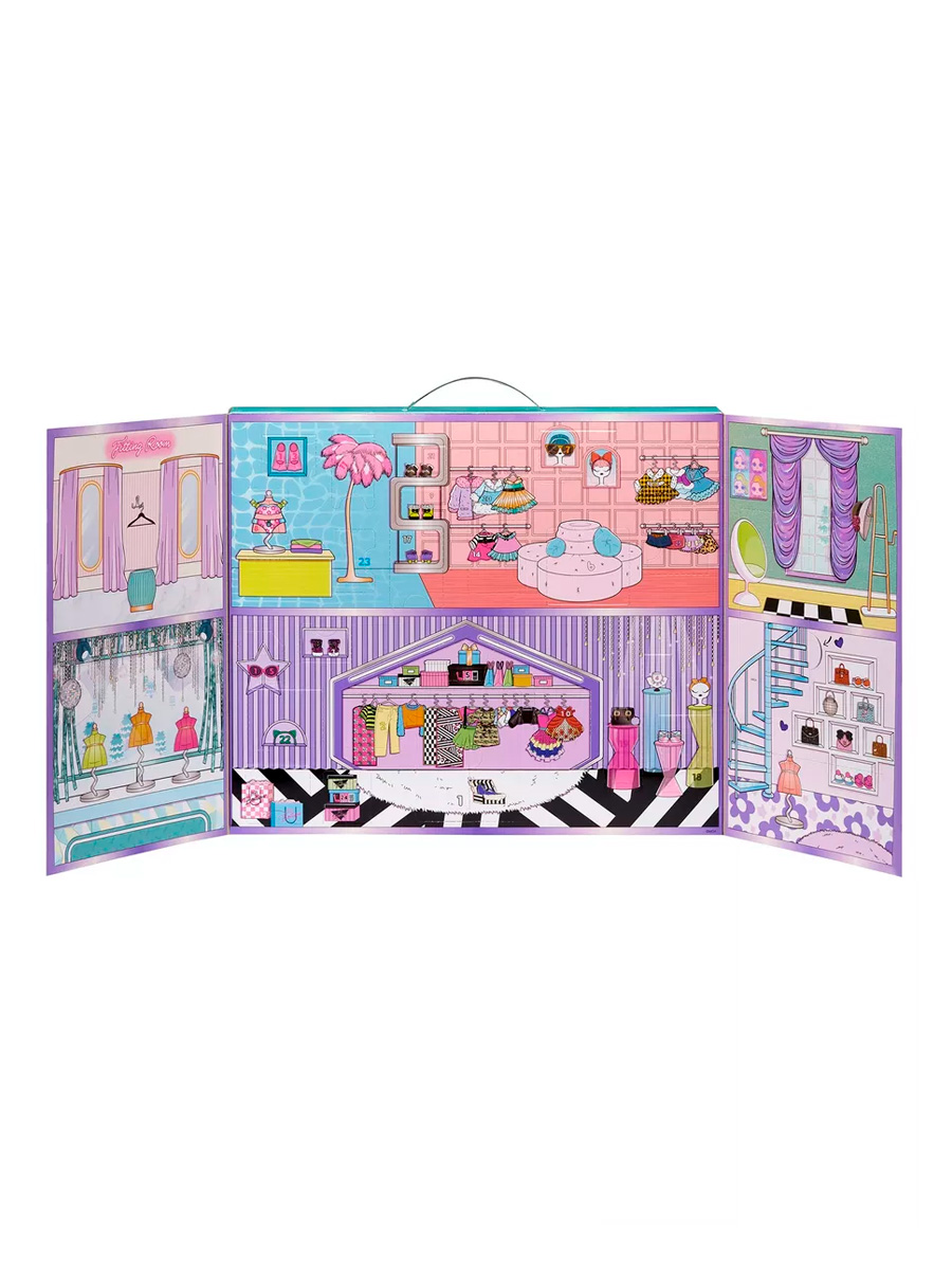 Адвент-календарь в виде роскошного торгового центра для кукол. Картонный чемодан с ручкой для раскладывания. Смешивайте и сочетайте наряды для бесконечного количества модных образов. Окна для ежедневного открытия - можно собрать весь набор (открыв все окна). Ограниченный выпуск.