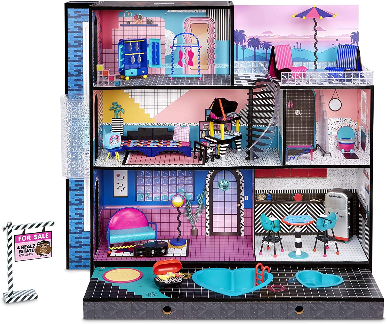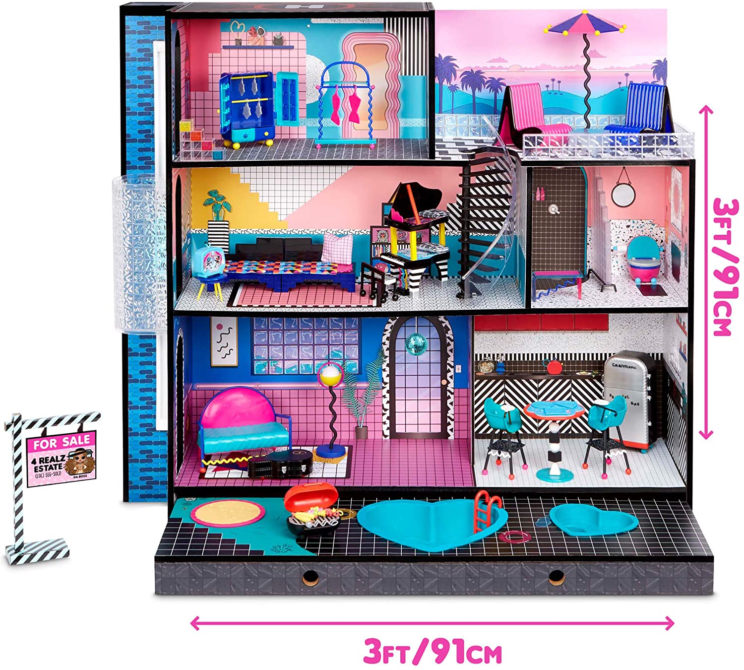 Новый кукольный 3-х этажный деревянный дом с 6 игровыми комнатами и 85 сюрпризами. Высота дома – почти 1 метр. Некоторые элементы дома подвижные, есть подсветка и звуковые эффекты. На первом этаже гостиная и кухня с мебелью и аксессуарами. Перед домом большая площадка с бассейном для холодной воды, джакузи для теплой воды, песочницы для кинетического песка для питомцев.