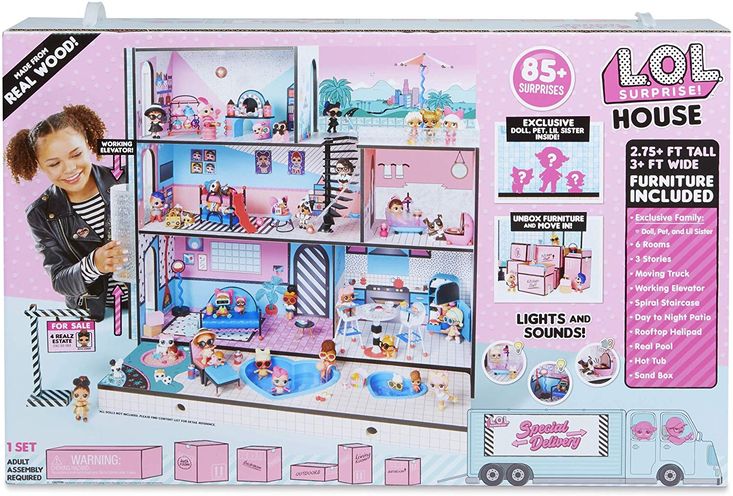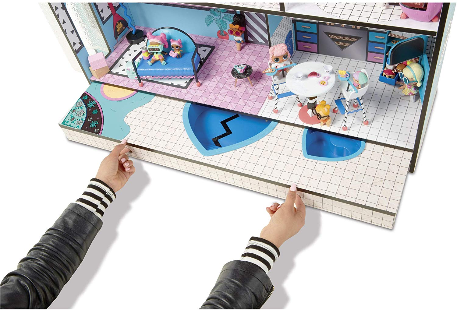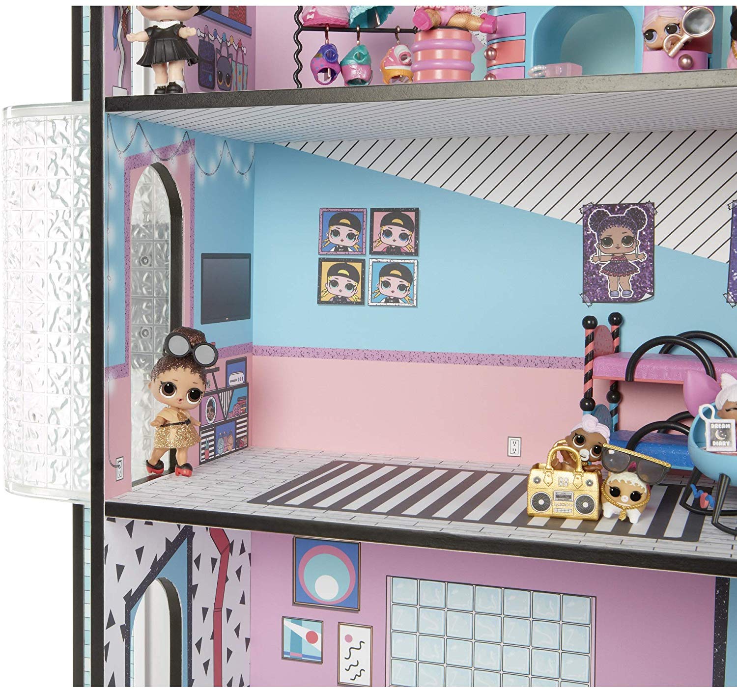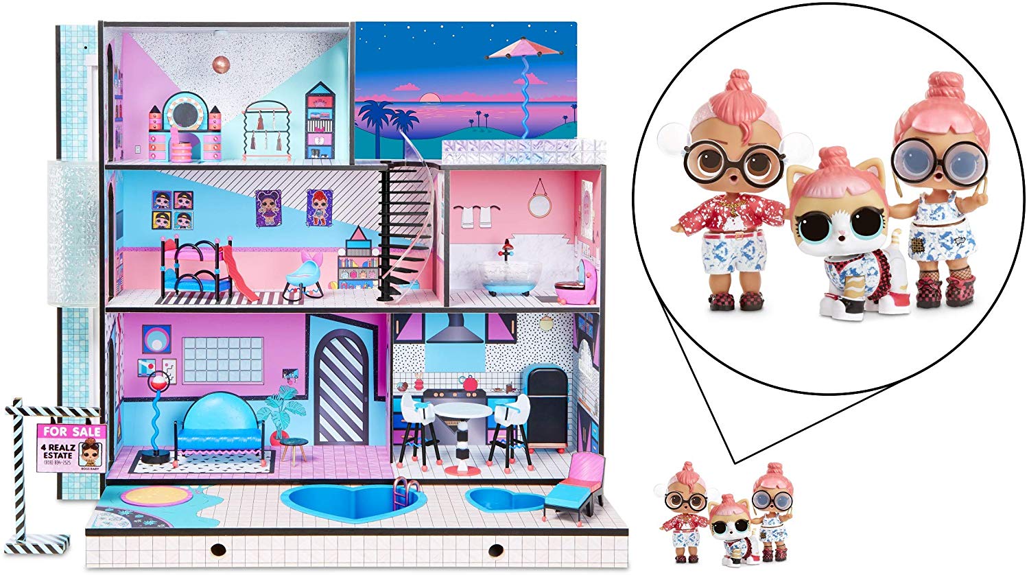 Трехетажный дом «LOL Surprise House» от MGA Entertainment обустроен световой подсветкой и множеством необычных, дизайерских предметов мебели. Помимо него, в коробке спрятано множество сюрпризов и аксессуаров для кукол, а также три новых пупса.