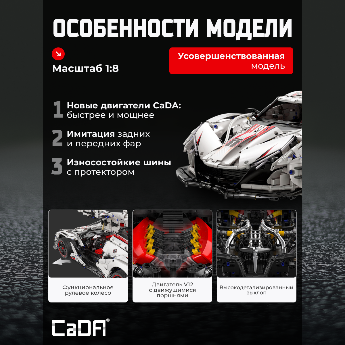 Конструктор CaDA Helios Supercar 4449 деталей C61053W представляет собой модель спортивного автомобиля с уникальными элементами. Симуляция передней части автомобиля включает фары и широкую вентиляционную решётку, а также дверь типа "крыло чайки", которая открывается на 90 градусов вверх. Модель управляется с помощью пульта 2.4 ГГц для движения вперёд/назад и поворота влево/вправ, оснащена мощным монстр-двигателем с возможностью переключения между двумя скоростями. В дополнение, спортивный автомобиль оснащён мощным V12 двигателем с моторной связкой, что демонстрирует отличную мощность и производительность. Задняя часть автомобиля включает цельный большой спойлер с регулируемым хвостовым спойлером. Подвижные элементы: Открытие дверей типа "крыло чайки" на 90 градусов; Движение вперёд и назад; Поворот влево и вправо; Регулировка хвостового спойлера. Конструктор включает в себя мощные механизмы и элементы, такие как моторная связка и V12 двигатель, а также систему управления для пульта и управления движения модели. Этот конструктор идеально подходит для любителей автомобилей и скоростных моделей, а также для тех, кто увлекается радиоуправляемыми моделями с высокой мощностью. Характеристики: Модель: C61053W; Категория: Автомобили и транспорт; Деталей: 4449; Размер упаковки: 56,7 х 37,3 х 14,6 см; Размер собранной модели: 60 х 27 х 14 см; Вес: 6,425 кг. Входит в комплект: Детали для сборки модели; 1 х Пульт дистанционного управления (без батереек); 1 х 7.4 В литий-ионный аккумулятор; 2 х Мотор; 1 х Серводвигатель; 1 х USB кабель для зарядки аккумулятора. Не входит в комплект: 2 х Батарейки типа АА для пульта дистанционного управления. Конструктор CaDA Helios Supercar — это великолепная модель для любителей автомобилей и радиоуправляемых моделей. Подходит как для детей, так и для взрослых, которые заинтересованы в моделях с высокой мощностью и эффектным дизайном.Характеристики