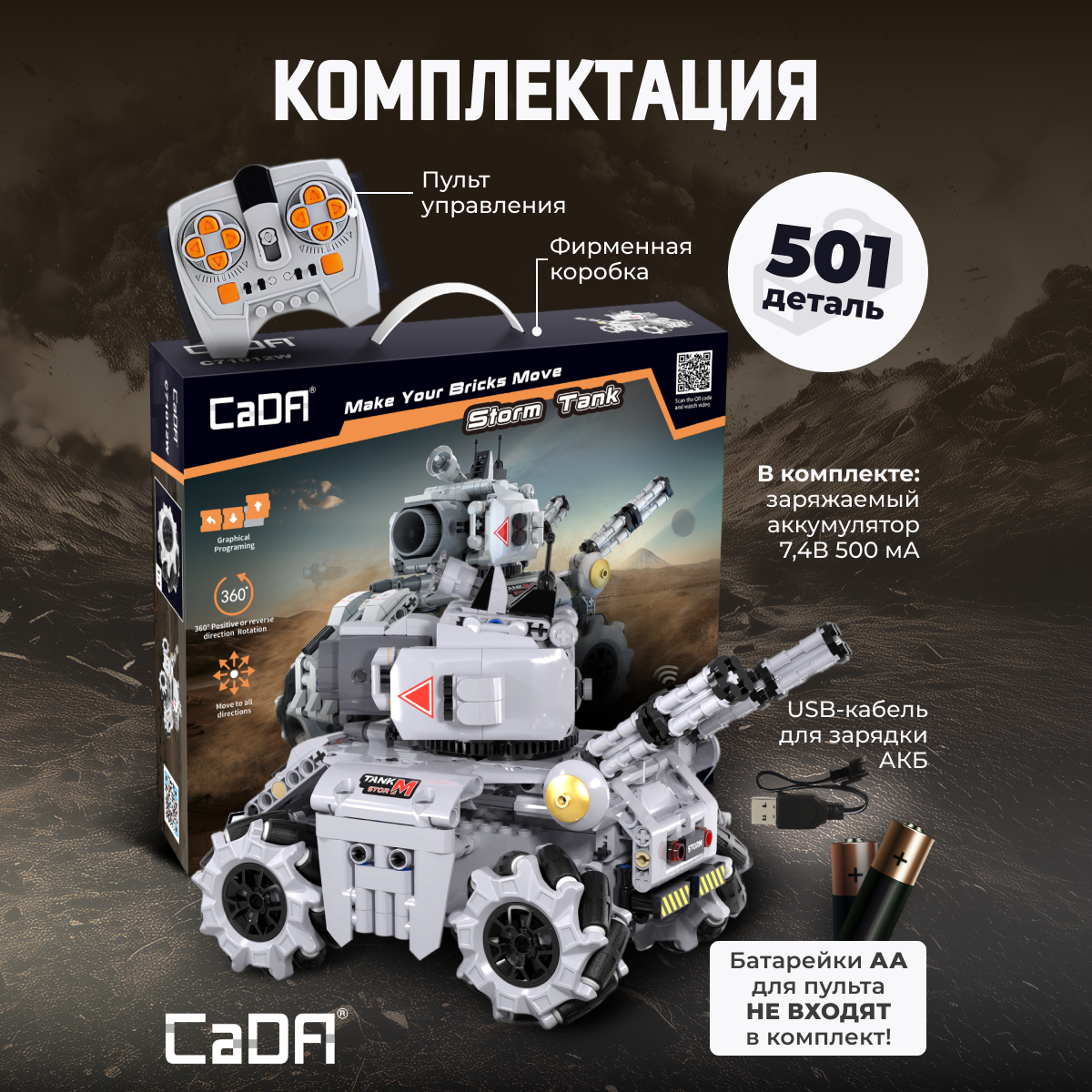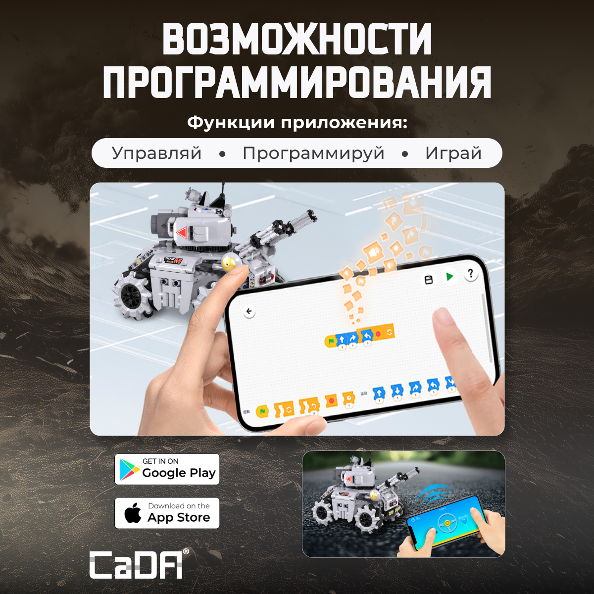 Конструктор CaDA The storm tank C71012W представляет собой радиоуправляемую модель военной техники с двумя режимами работы: через 2.4G и Bluetooth APP. Управление через приложение предоставляет различные интерфейсы, включая интерфейс пульта дистанционного управления, гироскопа, планирования пути и программного управления. Танк способен двигаться в 10 направлениях, включая прямое движение вперёд, назад, влево, вправо, а также 4 диагональных направления и вращение по часовой и против часовой стрелки. Башня танка может быть вручную повёрнута на 360 градусов для достижения максимальной манёвренности. Подвижные элементы: Движение вперёд и назад; Движение влево и вправо; Движение в 4 диагональных направления; Вращение башни на 360 градусов; Вращение по часовой стрелке и против часовой стрелки. Конструктор включает в себя систему управления через приложение, позволяющую разнообразные возможности для маневрирования моделью. Модель также поддерживает управление через пульт дистанционного управления, что добавляет удобства в эксплуатации. Этот конструктор идеально подходит для любителей военной техники, а также для тех, кто хочет освоить управление моделями с помощью мобильных приложений и пультов дистанционного управления. Характеристики: Модель: C71012W; Категория: Военная техника; Деталей: 501; Размер упаковки: 42 х 9 х 34 см; Размер собранной модели: 17 х 14 х 14 см; Вес: 1,44 кг. Входит в комплект: Детали для сборки модели; 1 х Пульт дистанционного управления (без батереек); 1 х 7.4 В 500 мАч литий-ионный аккумулятор; 1 х USB кабель для зарядки аккумулятора. Не входит в комплект: 2 х Батарейки типа АА для пульта дистанционного управления Конструктор CaDA The storm tank — это отличная модель для поклонников военной техники, которая позволяет моделировать разнообразные маневры и движения, а также учить управлению через приложения и пульт дистанционного управления.Характеристики