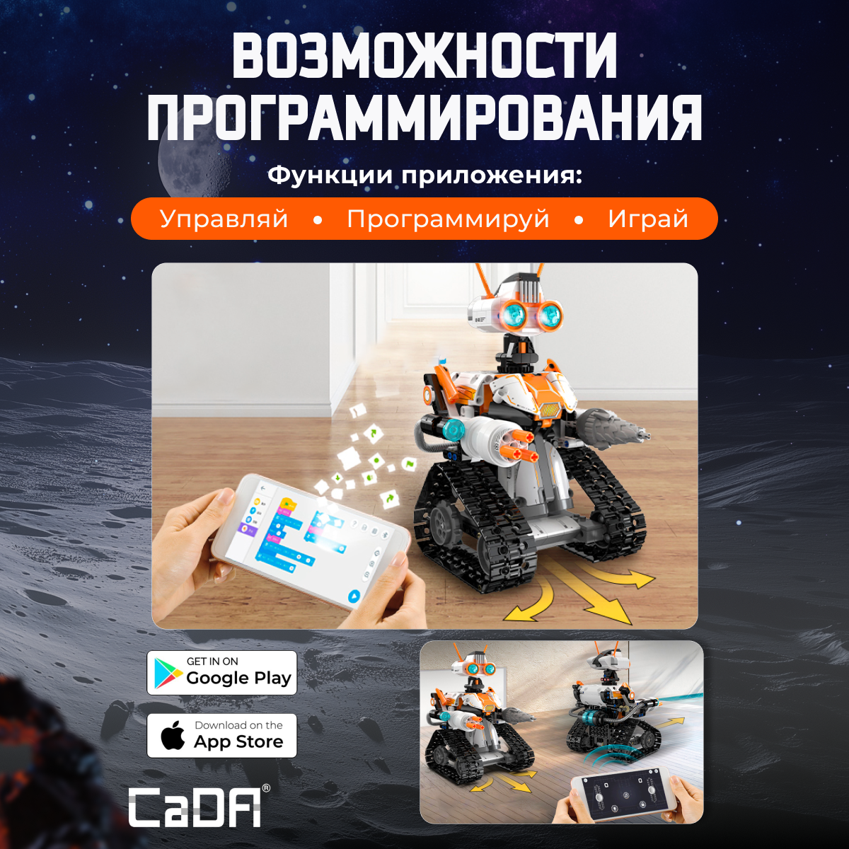 Конструктор CaDA Z-BOT Code Robot 462 деталей C83002W представляет собой интерактивного робота, который работает в двух режимах — через пульт 2.4G и Bluetooth-приложение. Робот может двигаться вперёд, назад, влево и вправо, а также качать голову и вращать вентиляторную лопасть на 360°. Управление также доступно через приложение, которое позволяет программировать робота через Scratch и управлять звуком. В дополнение робот оснащён LED светом, управляемым через пульт и приложение. Подвижные элементы: Движение вперёд и назад; Повороты влево и вправо; Качание головы; 360° вращение вентиляторной лопасти. Конструктор включает в себя систему управления через пульт и приложение, возможность программирования и работы с голосом. Это делает модель не только развлекательной, но и образовательной, позволяя освоить основы робототехники и программирования. Этот конструктор идеально подойдёт для любителей технологий и роботов, а также для детей и подростков, которые хотят развить свои навыки в области программирования и работы с роботами. Характеристики: Модель: C83002W; Категория: Роботы и технологии; Деталей: 462; Размер упаковки: 25 х 22 х 8 см; Размер собранной модели: 24 х 15,3 х 15,6 см; Вес: 1,041 кг. Входит в комплект: Детали для сборки модели; Аккумулятором 3.7 В; Комплекты освещения. Не входит в комплект: 2 х Батарейки типа АА для пульта дистанционного управления. Конструктор CaDA Z-BOT Code Robot — отличная модель для любителей робототехники, которая сочетает в себе интересные возможности управления и программирования. Отличный выбор для тех, кто хочет развить свои навыки в области технологий и робототехники.Характеристики
