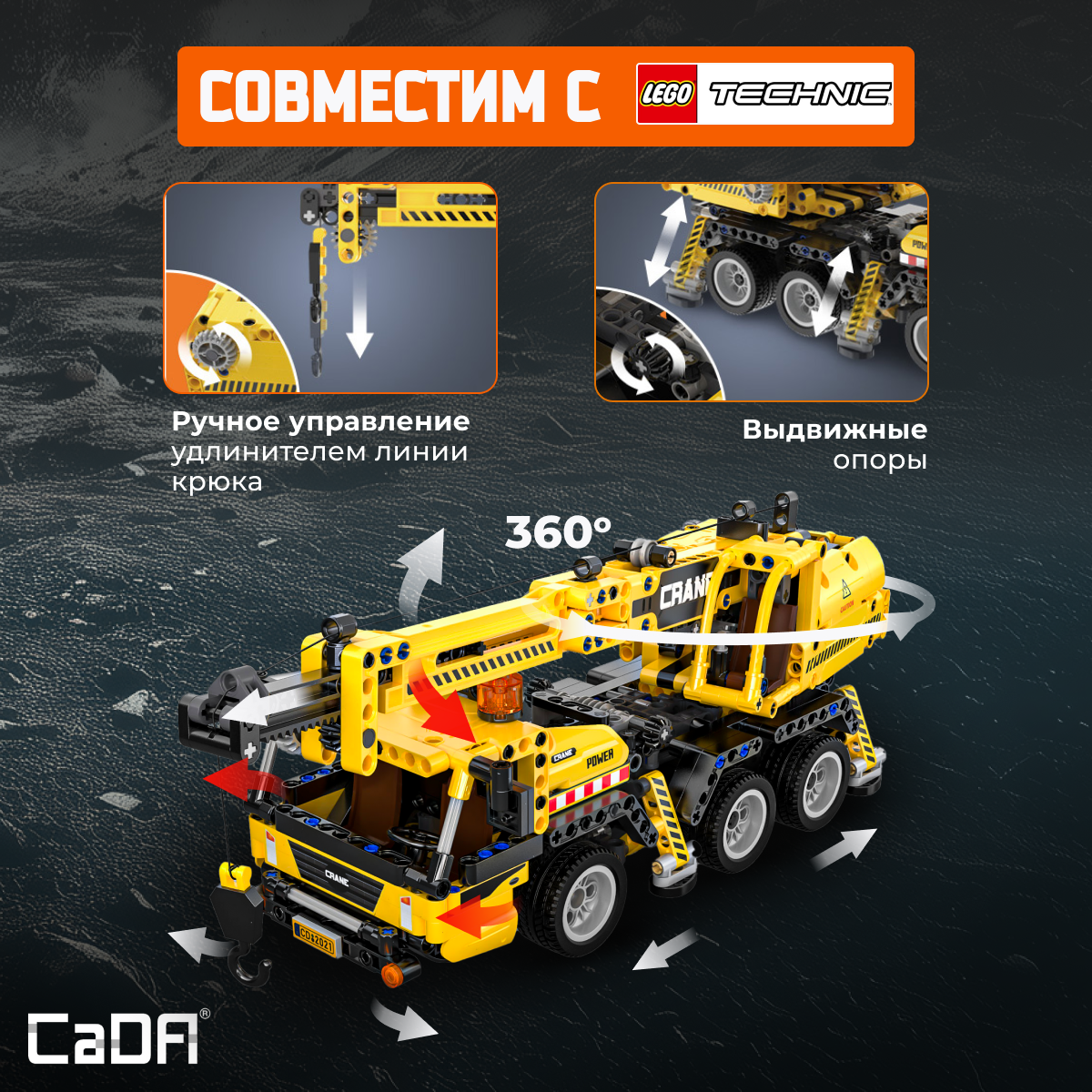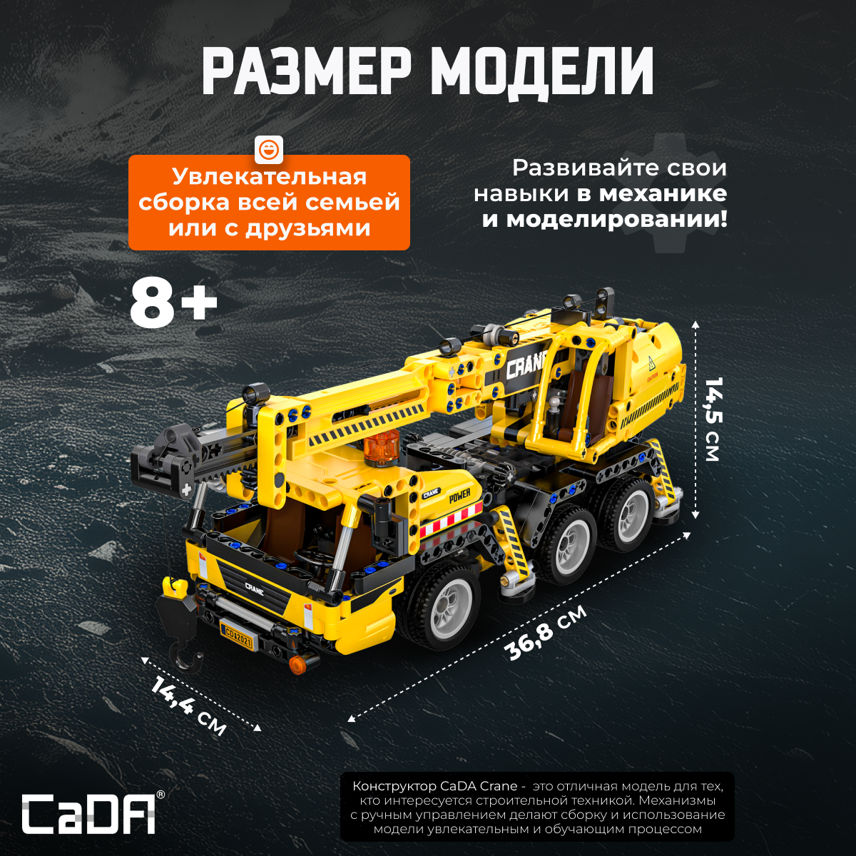 Конструктор CaDA Crane 658 деталей C65005W представляет собой модель строительного крана, которая сочетает в себе реалистичные механизмы и функциональные элементы. Модель имеет поворотный регулятор для контроля различных движений, таких как расширение стрелы и подъём кронштейна. Особенность конструкции — возможность вращать платформу и поднимать стрелу на 360°. Подвижные элементы: Ручной поворотный регулятор для контроля расширения стрелы, подъема кронштейна и подъема стрелы; 360° вращение операционной платформы колесного дома и подъём стрелы; Регулятор для управления рулевым колесом, открытием и закрытием дверей; Вручную контролируется движение машины вперёд и назад. Конструктор включает в себя элементы, которые позволяют собирать модель с подвижными и функциональными деталями. Это отличная модель для любителей строительной техники и механических конструкций. Характеристики: Модель: C65005W; Категория: Строительная техника; Деталей: 658; Размер упаковки: 35 х 24 х 6 см; Размер собранной модели: 36,8 х 14,4 х 14,5 см; Вес: 0,98 кг. Входит в комплект: Детали для сборки модели. Конструктор CaDA Crane — это отличная модель для тех, кто интересуется строительной техникой. Механизмы с ручным управлением делают сборку и использование модели увлекательным и обучающим процессом. Отличный выбор для любителей техники и механики.Характеристики