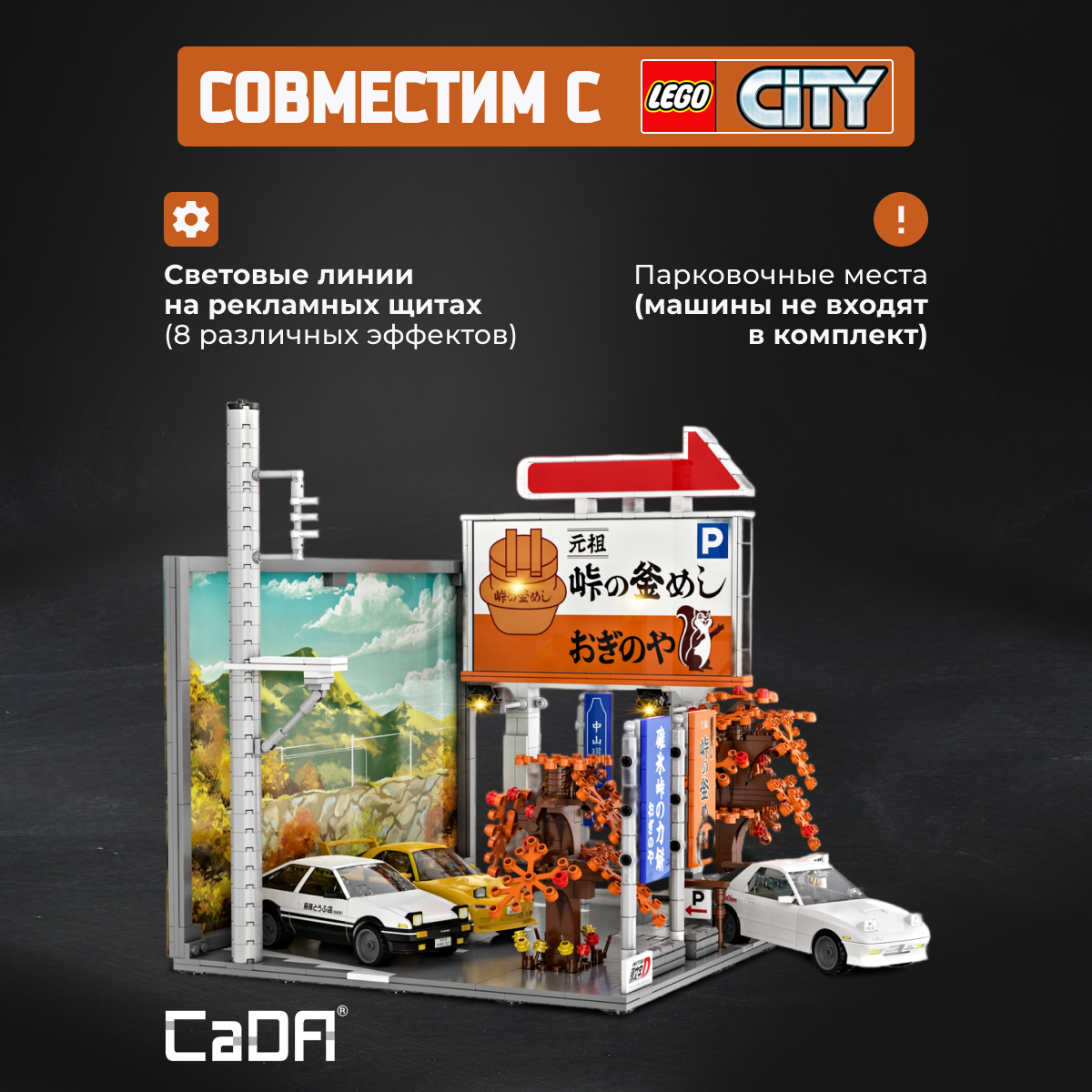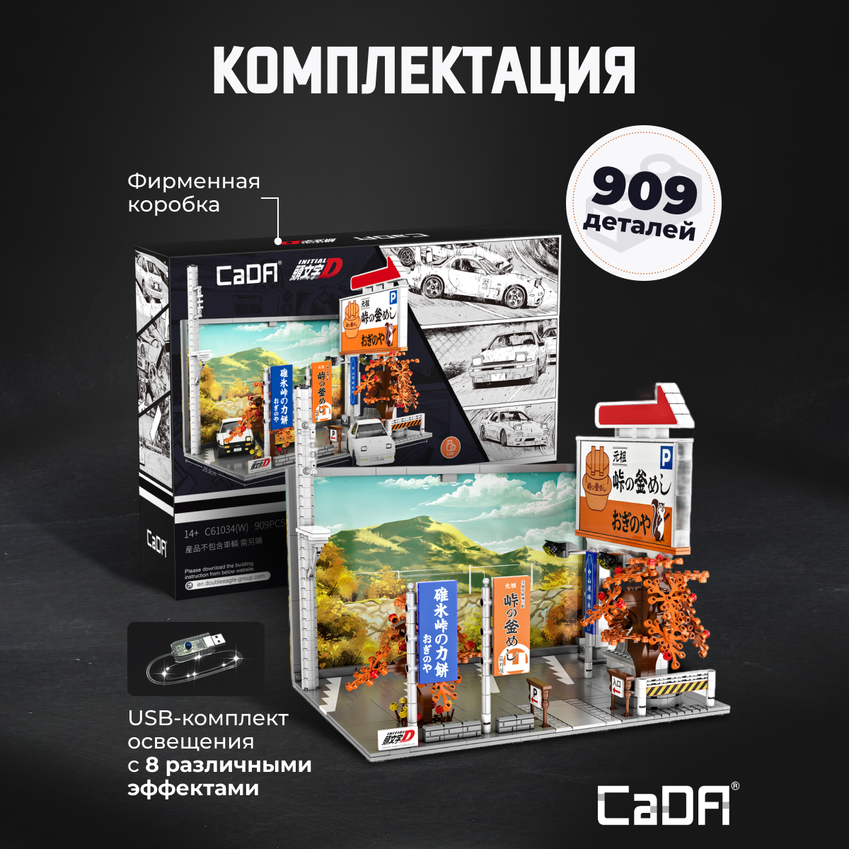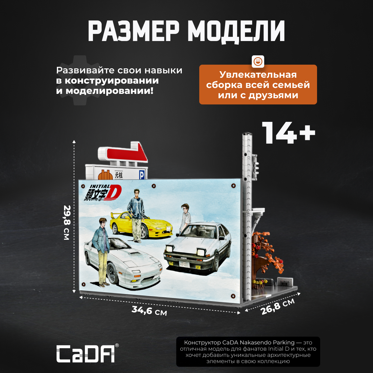 Конструктор CaDA Nakasendo Parking 909 деталей C61034W представляет собой модель парковки, выполненную по мотивам известного аниме Initial D. Этот конструктор включает в себя симуляцию внешнего вида с деталями, такими как рекламные щиты и флаги, а также позволяет воссоздавать атмосферу улиц из популярного аниме. Парковка может быть дополнена машиной, которая приобретается отдельно, а световые линии на рекламных щитах создают эффект дополнительного освещения, делая модель более реалистичной и привлекательной. Подвижные элементы: Открывание и закрывание дверей автомобиля (приобретает дополнительно); Световые линии на рекламных щитах. Конструктор включает в себя все необходимые детали для сборки парковки и ее декоративных элементов, а также USB комплект освещения для дополнительного эффекта. Этот конструктор идеально подходит для поклонников аниме Initial D и тех, кто интересуется архитектурой и моделированием городской среды. Характеристики: Модель: C61034W; Категория: Здания и архитектура; Деталей: 909; Размер упаковки: 38 х 30 х 9 см; Размер собранной модели: 34,6 х 26,8 х 29,8 см; Вес: 1,963 кг. Входит в комплект: Детали для сборки модели; 1 х Комплект освещения. Не входит в комплект: Машина (приобретается отдельно). Конструктор CaDA Nakasendo Parking — это отличная модель для фанатов Initial D и тех, кто хочет добавить уникальные архитектурные элементы в свою коллекцию.Характеристики