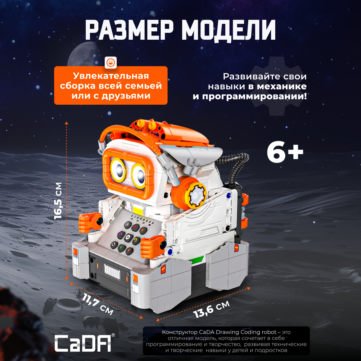 Конструктор CaDA Drawing coding robot 461 детали C83006W представляет собой уникальную модель робота, который сочетает в себе элементы программирования и рисования. Робот оснащен светодиодной подсветкой и может выполнять различные действия, управляемые через приложение. Это отличная модель для детей и подростков, интересующихся робототехникой и программированием. Подвижные элементы: Дистанционное управление через приложение: движение вперед/назад, поворот влево/вправо; Программирование через приложение Scratch: ввод инструкций с помощью Scratch для соответствующего движения; Перемещение по нарисованному через приложение: рисование произвольных узоров в интерфейсе рисования, робот будет двигаться соответственно; Со светодиодной подсветкой, играйте с удовольствием ночью. Конструктор включает в себя все необходимые элементы для работы робота, включая маркер для рисования и светодиоды. Этот конструктор идеально подходит для детей и подростков, интересующихся робототехникой и программированием, а также для тех, кто хочет развивать свои творческие и технические навыки. Характеристики: Модель: C83006W; Категория: Роботы и технологии; Деталей: 461; Размер упаковки: 30,7 х 23,8 х 11,9 см; Размер собранной модели: 13,6 х 11,7 х 16,5 см; Вес: 1,562 кг. Входит в комплект: Детали для сборки модели; Аккумулятором 3.7 В; Комплекты освещения; 2 маркера (красный и синий). Не входит в комплект: 2 х Батарейки типа АА для пульта дистанционного управления. Конструктор CaDA Drawing coding robot 461 детали C83006W – это замечательная модель, которая сочетает в себе программирование и творчество, развивая технические и творческие навыки у детей и подростков. Отличный выбор для начинающих инженеров и программистов.Характеристики