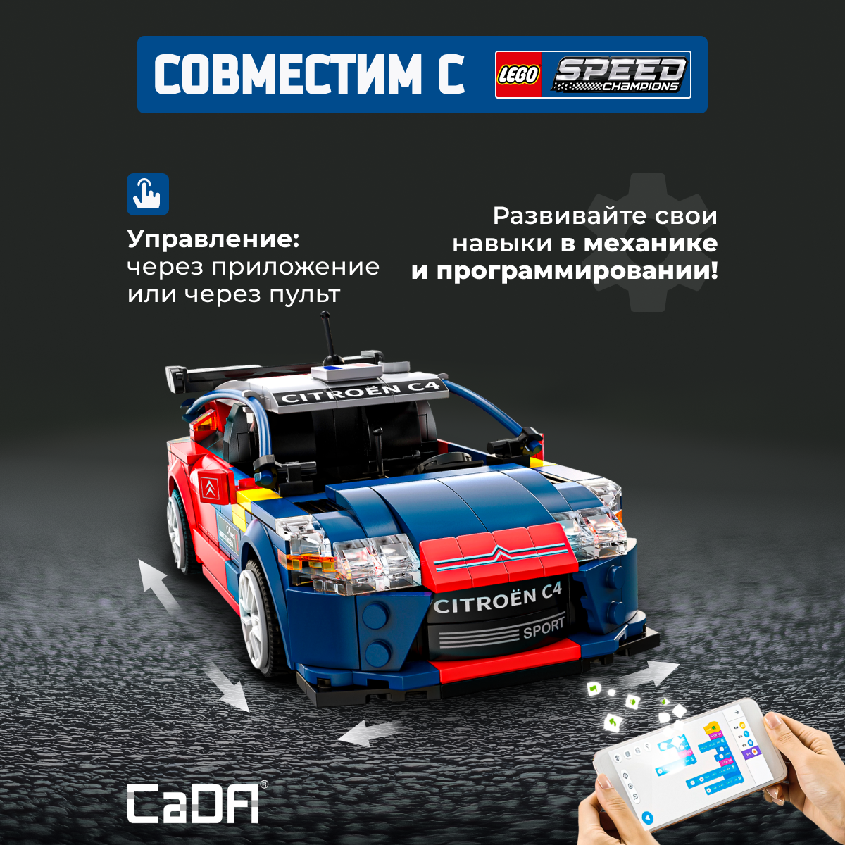 Конструктор CaDA 2008 Citroen C4 WRC 329 детали C51078W представляет собой высококачественную модель раллийного автомобиля Citroen C4 WRC. Этот конструктор включает в себя все необходимые элементы для сборки и дистанционного управления, позволяя воссоздать раллийный автомобиль с подвижными элементами и высокой степенью детализации. Подвижные элементы: Полноценное шасси в основе, легкая конструкция; Высокоскоростное вождение, максимальная скорость до 3.8 км/ч; Дистанционное управление для движения и рулевого управления. Конструктор включает в себя механизмы для вождения, рулевого управления и возможности дистанционного контроля через пульт или мобильное приложение. Также предусмотрены дополнительные режимы управления и функциональность для программирования. Этот конструктор идеально подходит для любителей автомобилей, ралли и робототехники, а также для тех, кто хочет научиться программировать и управлять моделями с помощью мобильных приложений. Характеристики: Модель: C51078W; Категория: Автомобили и транспорт; Деталей: 329; Размер упаковки: 30 х 6 х 21 см; Размер собранной модели: 19,8 х 9,6 х 8,2 см; Вес: 0,654 кг. Входит в комплект: Детали для сборки модели; 1 х Пульт дистанционного управления (без батереек); 1 х 3.7 В 500 мАч литий-ионный аккумулятор; 1 х USB кабель для зарядки аккумулятора. Не входит в комплект: 2 х Батарейки типа АА для пульта дистанционного управления. Конструктор CaDA 2008 Citroen C4 WRC – это замечательная модель для тех, кто интересуется автомобилями и технологиями управления. Это отличный выбор для увлеченных моделистов и поклонников раллийных гонок.Характеристики