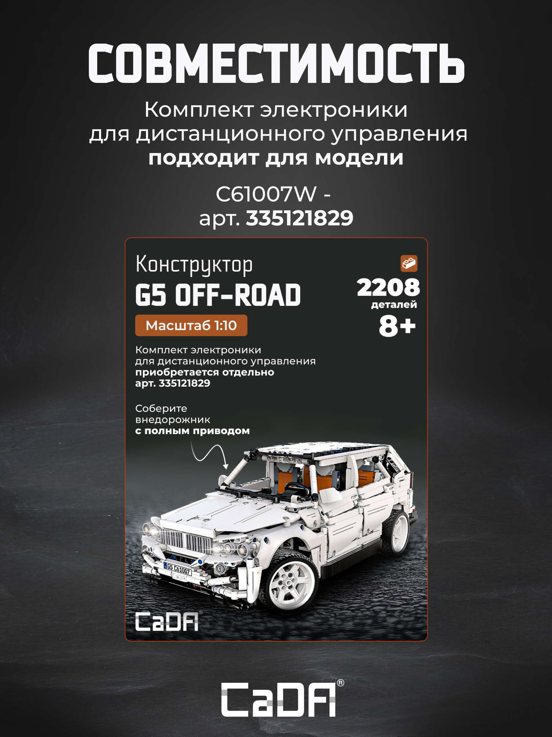 Аккумулятор CaDA 7.4V 500mAh с USB-зарядкой JV1010 - 1 шт. Пульт управления CaDA 2.4Ghz JV8011 - 1 шт. Мотор CaDA M Motor PRO 9V PTC-защита JV5030 - 1 шт. Мотор CaDA L Motor PRO 9V PTC-защита JV5028 - 1 шт. Сервомотор CaDA Steering Motor PRO 9V PTC-защита JV5029 - 1 шт. Световой модуль CaDA Light Kit JV3012 - 1 шт.