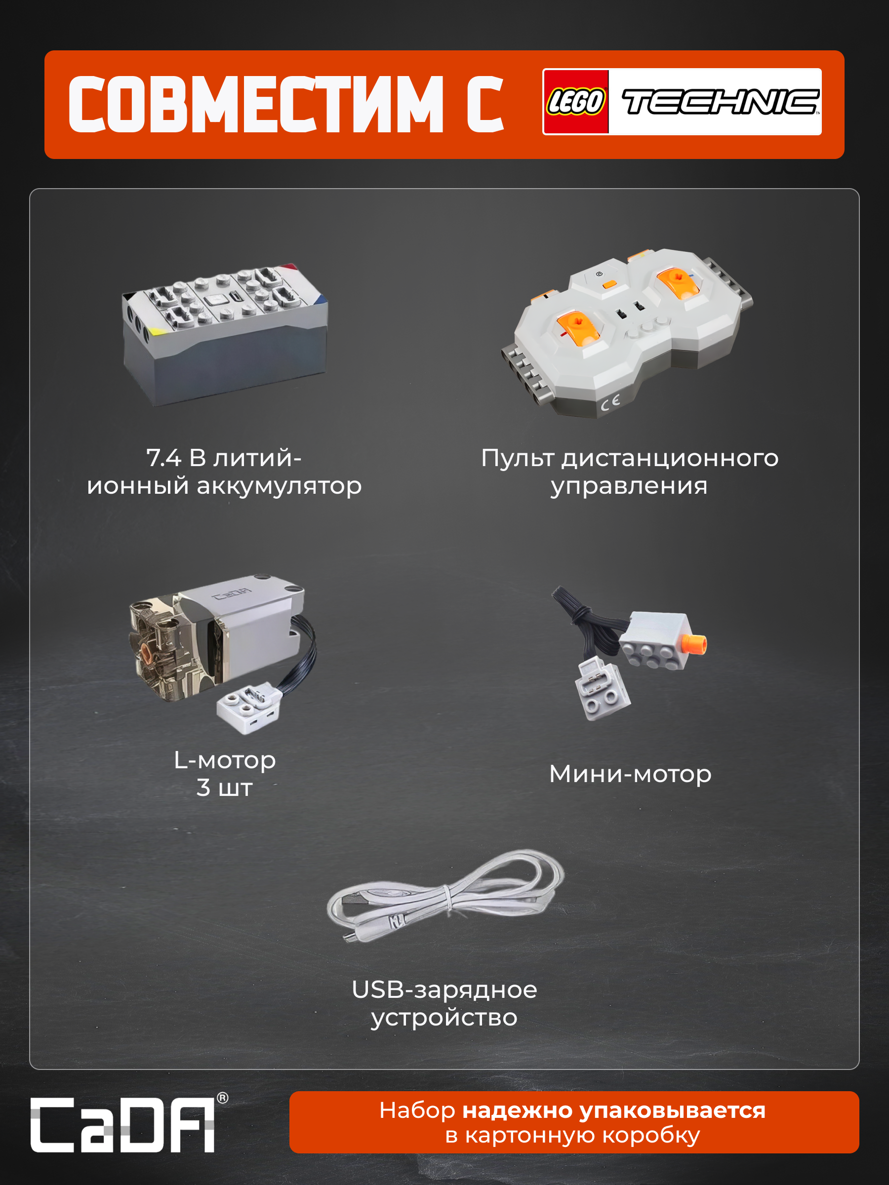 Аккумулятор CaDA 7.4V 500mAh с USB-зарядкой JV1010 - 1 шт. Пульт управления CaDA 2.4Ghz JV8011 - 1 шт. Мотор CaDA L Motor PRO 9V PTC-защита JV5028 - 3 шт. Мотор CaDA Micro Motor 9V PTC-защита JV5043 - 1 шт.